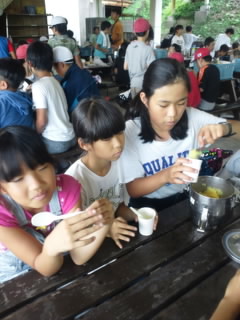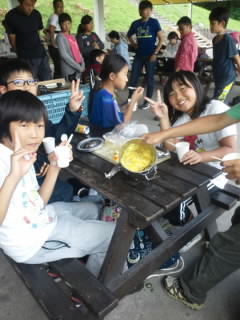 オレンジシャーベットを食べている様子です。どうしてできるのかな。少しふしぎな実験?でした。