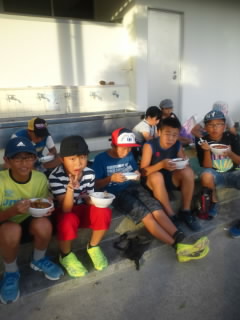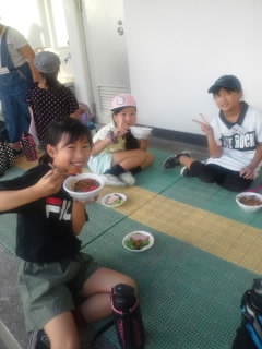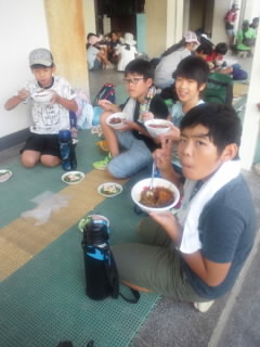 できあがったカレーをみんなで食べました。残さずしっかりいただきました。すいか割りで使ったカボチャもサラダにつけて食べました。