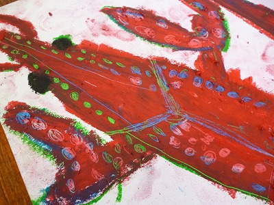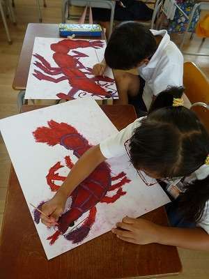 絵の具を重ね合わせたザリガニの絵に、竹串を使って、ザリガニの表面の細かな模様を削っていきます。