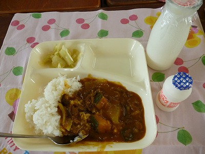 お野菜には、ナス、カボチャ、ピーマン、トマト、タマネギ、セロリ—が使われていました。野菜たっぷりのカレーで、みんなおいしくいただいていました。
