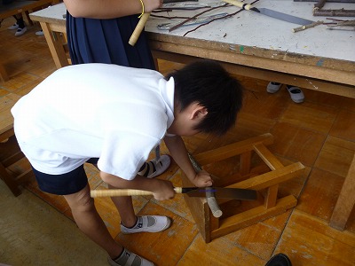 5年2組が図工室で、豊新の森で伐採した枝(乾燥させたもの)をノコギリや糸ノコを使って切断し、ボンドで接合していき、「森の妖精・小人」を制作していました。