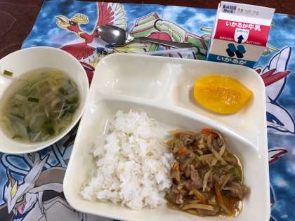 ピリ辛丼には、豚肉、たまねぎ、たけのこ、にんじん、枝豆、しょうが、にんにくが入っています。すこしピリッと辛口でしたが、よても美味しくいただくことができました。