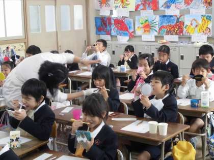 大阪市教育委員会から歯科衛生士さんに来ていただき、はみがき指導を行いました。
