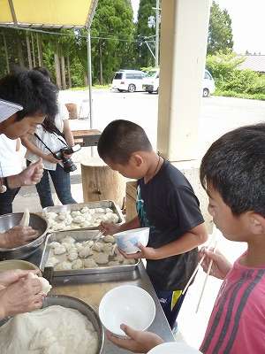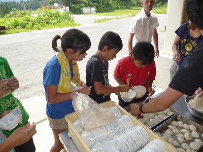 昼食には、先ほど全員でついた「おもち」を使っての豚汁です。