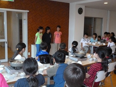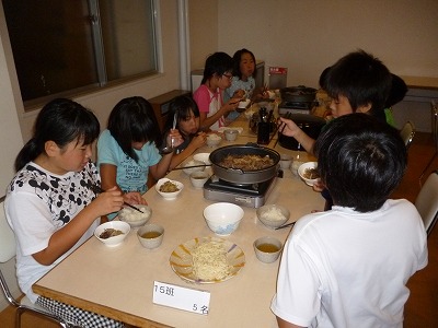 と思ったら、まだ、食べ足りずに、余った鍋のすき焼きのたれの中にご飯を入れて、最後の「しめ」にしている班もありました。