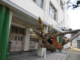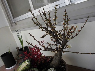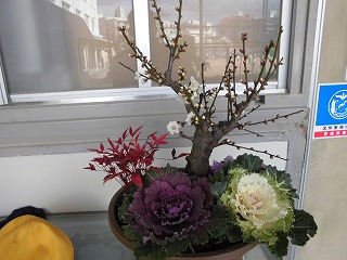 校長室の前にある寄せ植えの梅の花が咲き始めました。