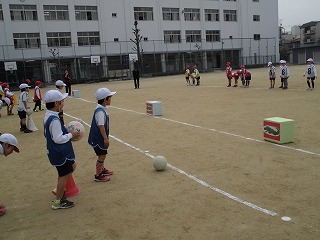 的(段ボール箱)にワニやへびなどの絵が描いてあり、それに向かって正確にけっていくゲームです。
