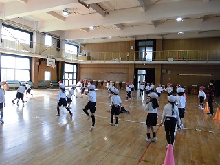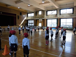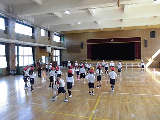 今日は、講堂で、なわとびやゲームをした後、ドッジボールをしました。