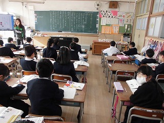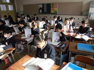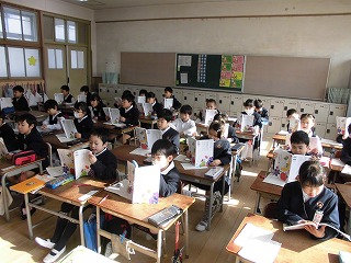 くだものや楽器についてみんなで発表した後。全員で音読しました。