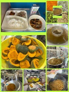 かぼちゃのいとこ煮は、だしで煮上げたかぼちゃにうすくちしょうゆなどで味付けし、ドライパックのあずきを加えて煮ています。