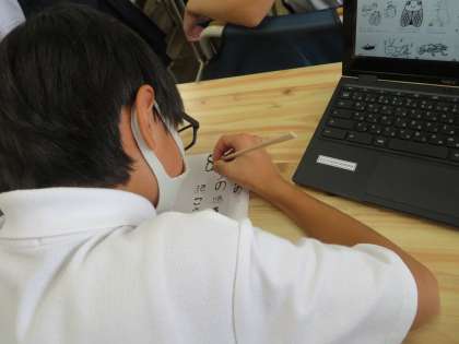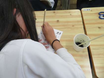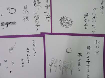 国語の学習で、俳句を作りました。季語を取り入れ、五七五の十七音で感じたことを書きました。楽しんで俳句を作ることができました。友だちと交流をした後は、「はしペン」で俳句を絵葉書風に書きました。墨汁を使うことで、味のある作品ができました。