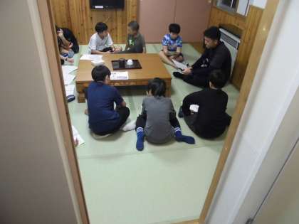 活動班リーダー・生活班リーダーが集まり、今日一日の反省や明日の連絡を確認していました。