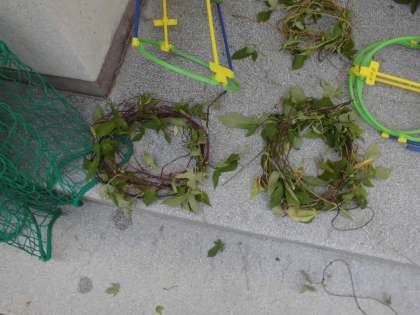 4月末に植えたアサガオのツルを使ってリース作りをしています。