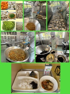 含め煮は、けずりぶしでだしをとり、にんじん、たまねぎ、つなこんにゃく、じゃがいも、あつあげ、青みにさんどまめを使用した煮ものです。