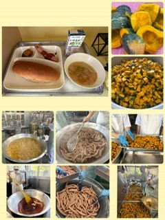 焼きかぼちゃは、生のかぼちゃに、塩、綿実油で下味を付け、焼き物機で蒸し焼きにします。北海道産の甘くておいしいかぼちゃです。