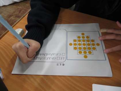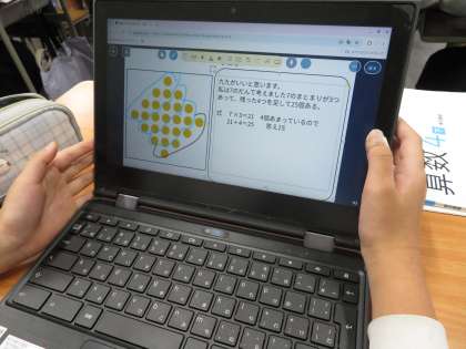 授業では、たくさんの丸が並んだ図を見て、効率よく数を数える方法を考えました。計算のきまりを使って式を立てたり、図に書き込んだりして、試行錯誤を繰り返していました。