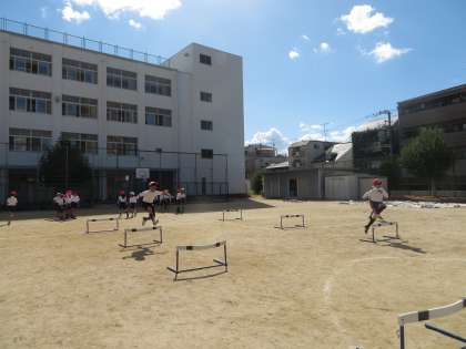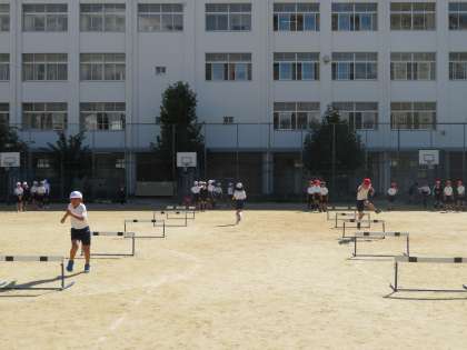 ハードル走の学習では、どの子もとても意欲的に取り組んでいます。歩幅を合わせることに苦戦している姿も見られますが、あきらめずに何度も挑戦する姿がとても頼もしいです!