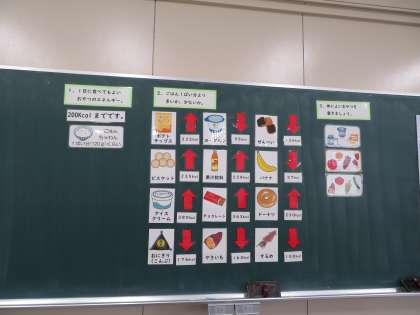 授業では、まず一日に食べてもよいおやつの量について学び、「おやつの目安は約200キロカロリー」ということを知りました。