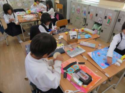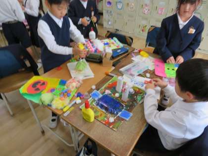 夏休みに集めた廃材を使って、わ!と驚くようなお面を作っています。