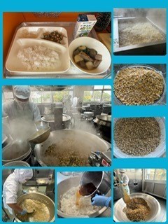 じゃこ豆は、ゆでたちりめんじゃこと、でん粉をまぶしてなたね油であげた大豆に、甘辛い調味液をからませます。かみごたえのある、児童に好評な献立です。