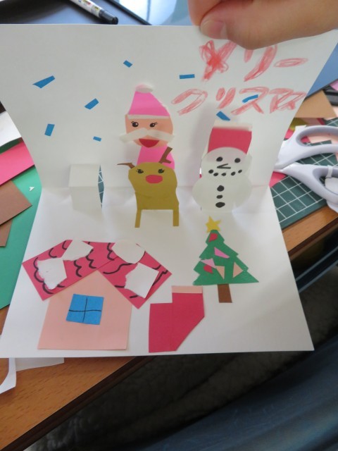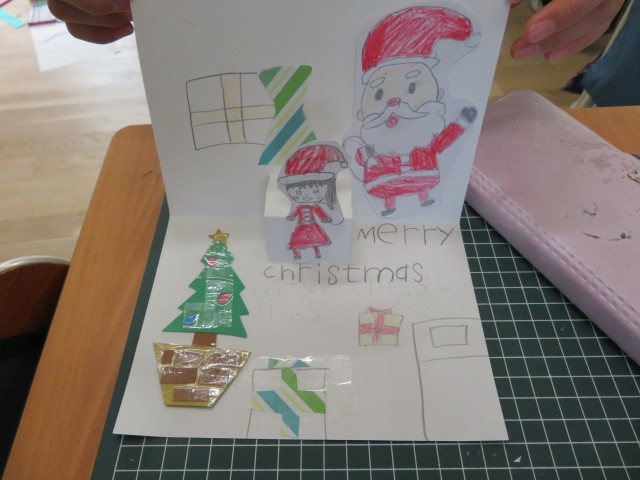 紙の真ん中に切れ目を入れ立体にし、そこにサンタやツリー、プレゼントなど貼り付けました。