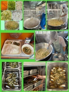 いわしのしょうが煮は、1人2尾のいわしを切りこんぶ、調味液とともにミニバットに入れて、せん切りのしょうがを加え、焼き物機で煮ます。しっかり温度をはかっています。