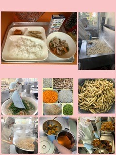 豚肉とあつあげの煮ものは、けずりぶしでだしをとり、豚肉、あつあげ、だいこん、にんじん、れんこん、青みにさんどまめを使用しています。
