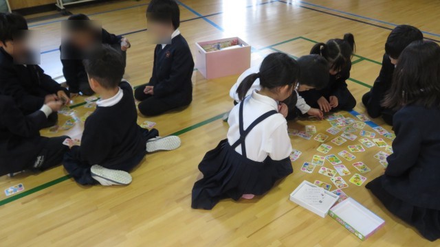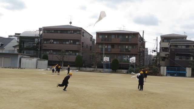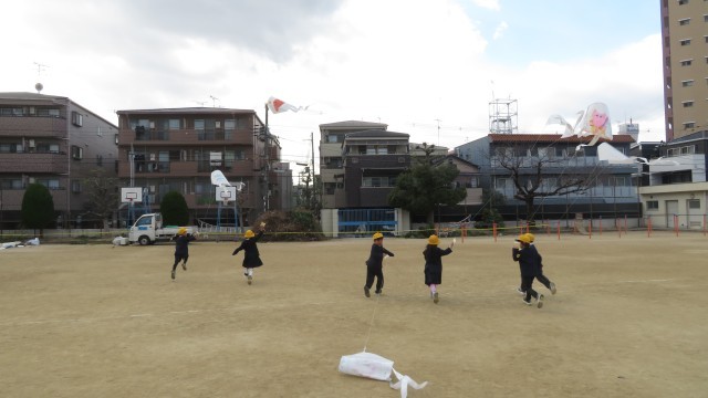 昔遊びでは、かるた・だるま落とし・こま・羽子板・けん玉・凧揚げ等の遊びをしました。普段遊ぶことが少ない遊びを楽しんでいました。中にはこま回しの達人や、けん玉の達人もおり、「凄い!」と盛り上がっていました。凧揚げでは、風に揺られて高く揚がる自作の凧に、大興奮の様子でした。「高く揚がったよ!」と嬉しそうに報告してくれる子どもがたくさんいました。