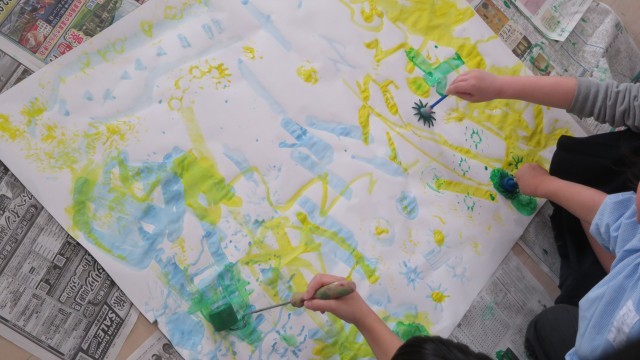 ぺったんコロコロでは、色々な絵具をローラーやスタンプ、手を使って自由に遊びました。道具や手を上手に使って、面白い形を作って楽しむ子どもたちの姿が見られました。