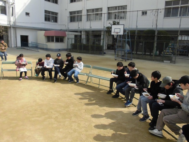カレーができました。寒空の中ですが、自分たちで作ったカレーは「美味しい」と口々に言いながら食べています。食べ終わった人から片づけをして、今は鬼ごっこをしています。