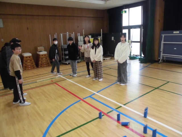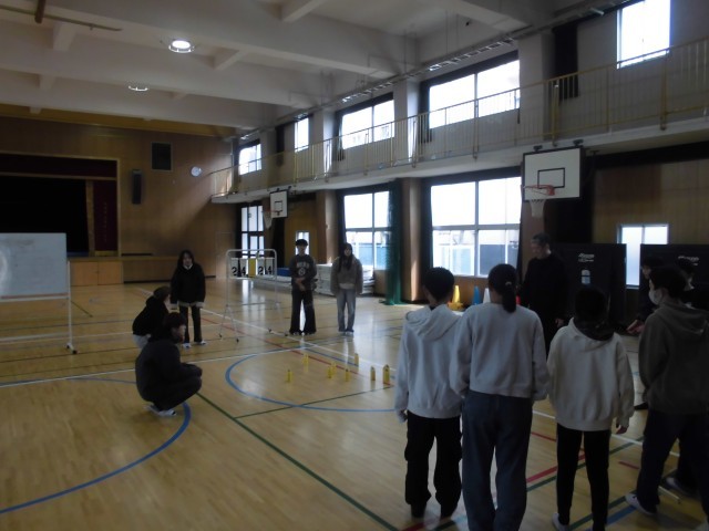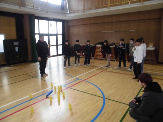 食事の後は、講堂でニュースポーツの「モルック」です。得点が入るたびに、大きな歓声が響いています。