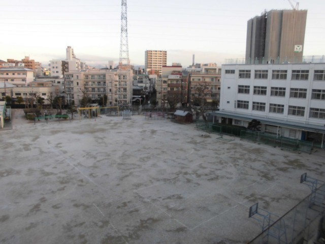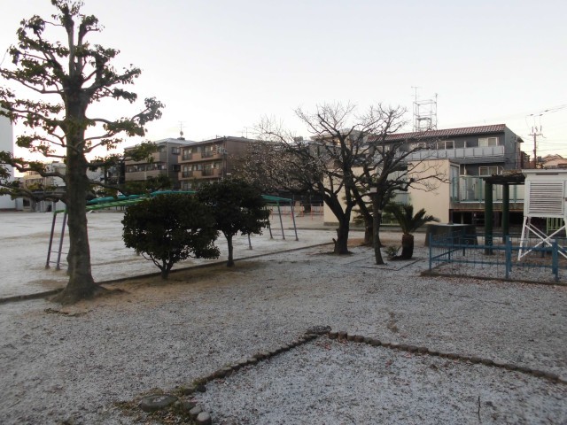 昨日の寒波で、運動場が白くなりました!今日2月9日午前7時ごろの風景です。豊新の森もうっすらと白くなっています。なかなか観ることができない風景です。