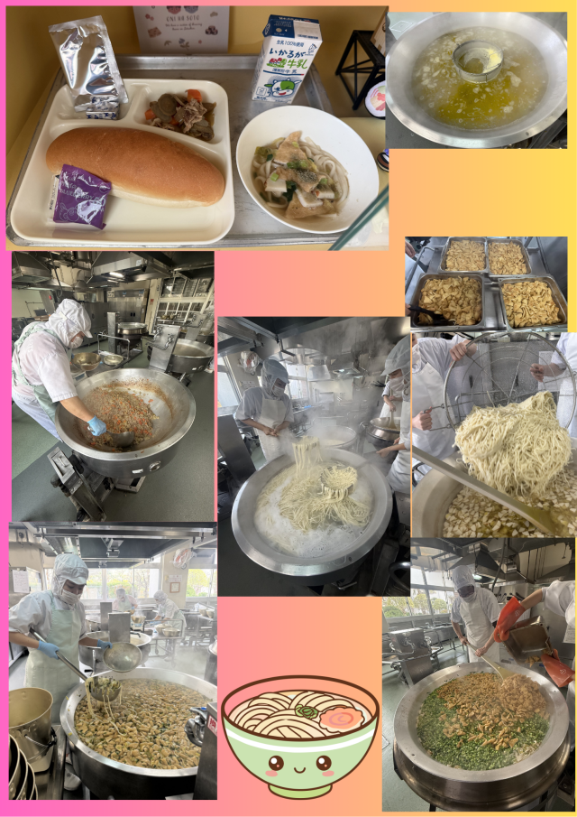 なにわうどんは、三角形に切ってあまからく煮たうすあげ、かまぼこ、はくさいと青みに青ねぎを加え、だしの旨みを味わうことができるシンプルなうどんに仕上がっています。教室で配缶後、とろろこんぶを1人1袋入れていただきます。