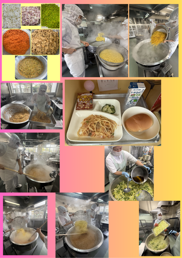 さけのスパゲッティは、紅ざ家(フレーク)を使用して春らしい淡いピンク色に仕上げ、グリンピースで彩りをよくしています。今年より、牛乳、クリームを使用せず、シチューの素を使用することで、乳アレルギーの児童も喫食できるようにしています。また、むきえだまめを使用せずグリンピースを使用することで大豆アレルギーの児童も喫食できるようにしています。