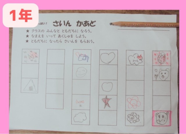 同じクラスになった人と仲良くなるために「さいん かあど」を用いて、友だちに名前を伝え、握手をし、サインをしてもらう活動を行いました。自分なりのサインを考え、友だちと交流することができました。