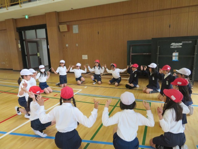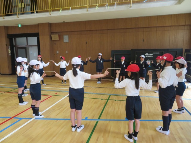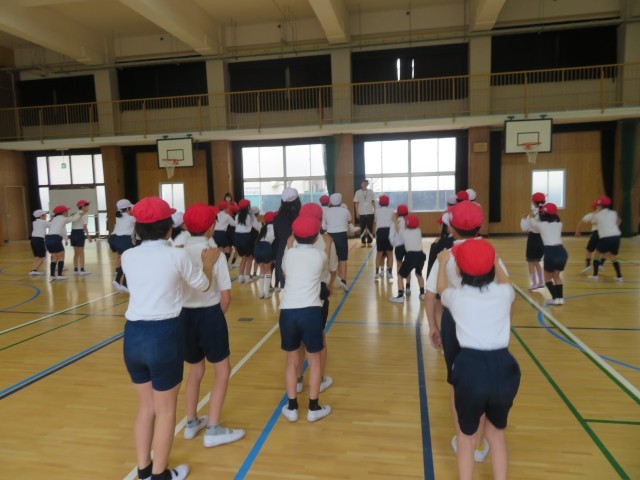 4年生になって初めての体育は、2クラス合同で体ほぐしの運動を行いました。