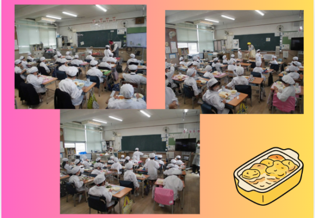 じゃがいものミートグラタンは、牛ひき肉、豚ひき肉、じゃがいも、たまねぎなどを使用したケチャップ味のグラタンです。児童に人気の献立です。