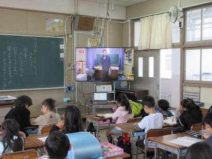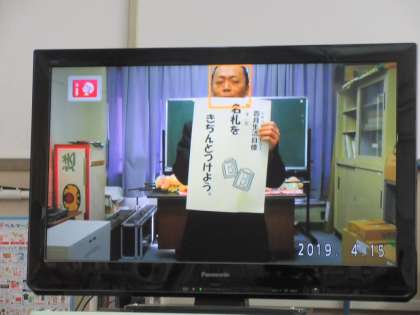 大型テレビの画面に校長先生が映り、お話を聞きました。