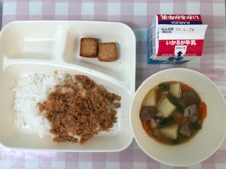 18日の給食は、鶏肉とじゃがいもの煮物・あつあげのしょうゆだれかけ・べにざけそぼる・ごはん・牛乳です。