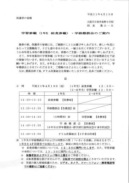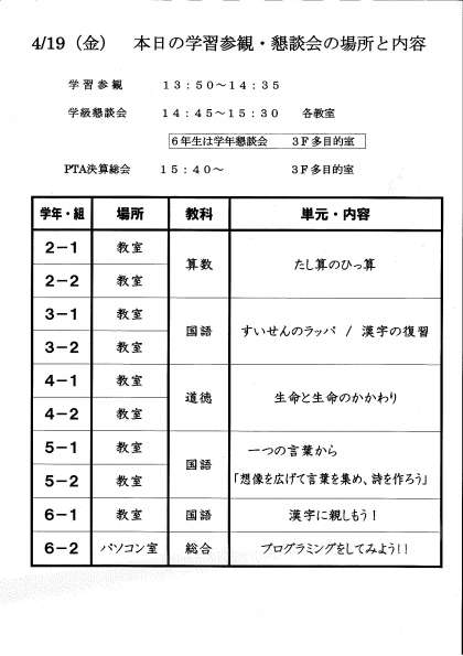 明日4月20日(金)は、学習参観(1年生は給食参観)と学級懇談会があります。