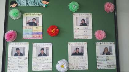 職員室隣の階段のところに、新聞掲示委員会の児童たちが新しく転任された先生の紹介を掲示してくれています。