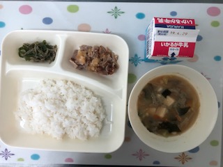 23日の給食は、豚肉のおろしじょうゆかけ・みそ汁・じゃこピーマン・ごはん・牛乳です。