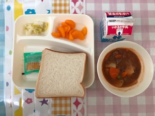26日の給食は、ビーフシチュー・キャベツのピクルス・みかん(缶)・食パン・りんごジャム・牛乳です。