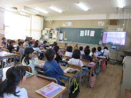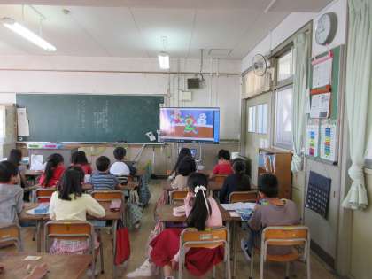 朝のモジュール学習で、外国語活動では、映像を見ながら、元気な声が聞こえてきました。