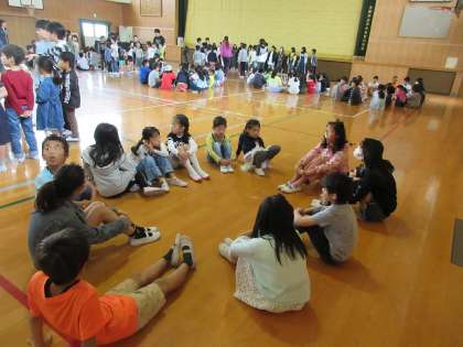 集会委員の進行で、各班ごとに整列しました。そのあと、班ごとに丸い輪の形になって、自己紹介をしました。班で仲良く協力して活動をしていきましょう。