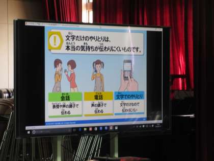 東淀川警察署の少年課の方とドコモの講師が来られて、インターネットに関する情報モラルや犯罪被害防止についてお話がありました。