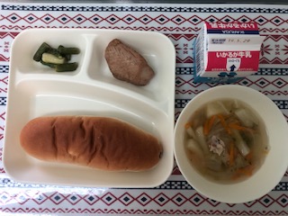 23日の給食は、かつおのガーリック焼き・鶏肉とじゃがいものスープ・グリーンアスパラガスのサラダ・レーズンパン・牛乳です。