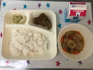 21日の給食は、ちくわのいそべあげ・鶏肉とひとくちがんもの煮物・あっさりキャベツ・ごはん・牛乳です。
