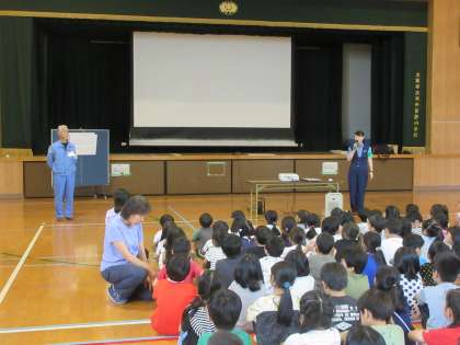 1.2年生は、5時限目に東淀川警察と区役所の方が来られ、防犯教室が行われました。誘拐や犯罪などから命を守るための5つの約束を教えてもらいました。