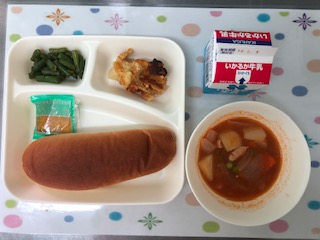 30日の給食は、ケチャップ煮・三度豆のソテー・りんごのクラフティ・大型コッペパン・牛乳・りんごジャムです。